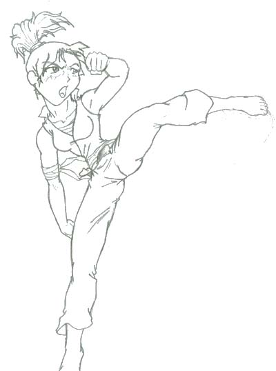 This one's a little weird. I mean... it's not even finished. It's just so great, though. I couldn't wait to finish it. It just kinda popped out while I was thinking of Street fighter's Chun Li. As you can see, I didn't know what I wanted t'do with her right arm. I'll finish this picture when I'm motivated. Everyone knows that if your not motivated, your likely to make a sh*tty picture.